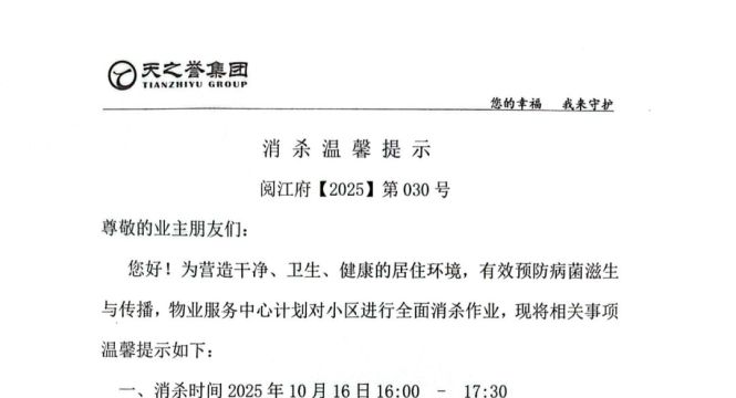 消 杀 温 馨 提 示 阅江府【2025】第030号尊敬的业主朋友们: 您好!为营造干净、卫生、健康的居住环境,有效预防病菌滋生与传播, ...