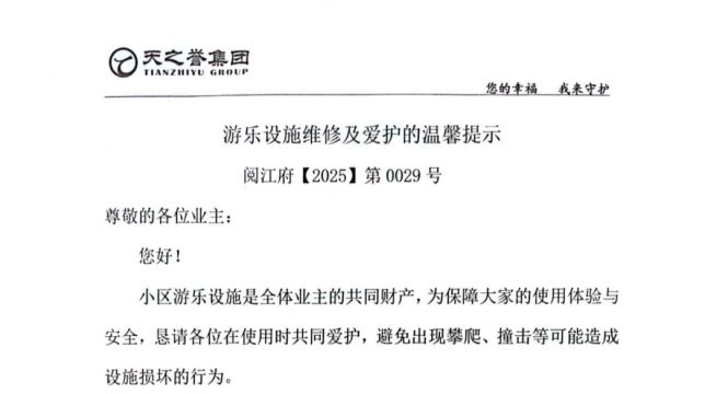 游乐设施维修及爱护的温馨提示 阅江府【2025】第0029号尊敬的各位业主:您好! 小区游乐设施是全体业主的共同财产,为保障大 ...