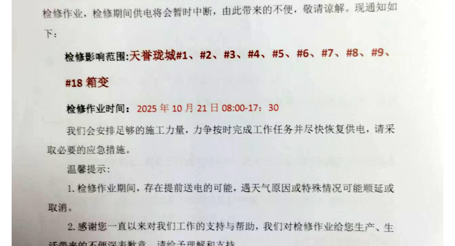电网检修停电通知 尊敬的各位业主: 接电业局2025年10月14日电网检修公告,天誉珑城小区将于本月21日8:00-17:30停电检修,现通知如下: 一、检修影响范围 1、 ...