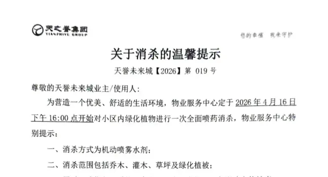 本帖最后由 徐勋勋 于 2026-4-16 17:45 编辑 关于楼宇及公共部位消杀温馨提示尊敬的各位业主/住户:为营造一个优美舒适的生活环境,物业服务中心将楼宇内进行 ...